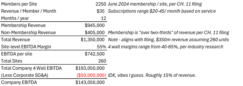 So this brings us back to Zips – which was one of the earlier PE-backed platforms, and the 5th largest operator of express car washes in the US. Atlantic Street Capital made its initial investment in May 2020, acquiring a majority stake from the Company’s founders. By this point, Zips was already a consolidator, having grown to 185 locations over a series of 40 acquisitions in the 2010s. Over the next few years, Atlantic Street supported the business with additional equity for acquisitions, bringing the total store count to 260, taking revenue to $345 million. The typical EBITDA margin for an express car wash chain is in the 40-50% range, so perhaps Zips had $150 million of EBITDA at this point. The rough breakdown of unit economics (based on some napkin math and what’s in their filings) and company-level profitability is below.