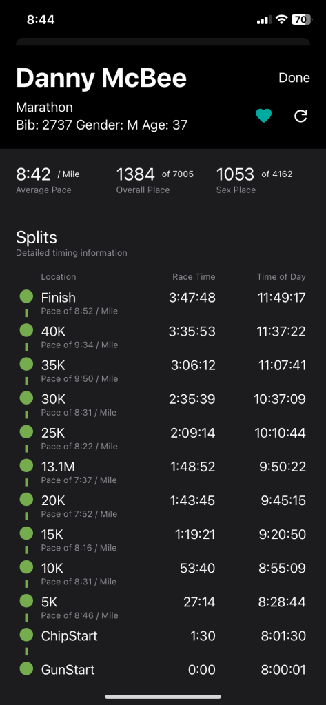 - Run a 1:30 half marathon or finish a full marathon: I initially drafted most of this from the plane ride back from Minneapolis, where I ran a marathon (a few days after giving notice at my job). I signed up for the race in early spring, had a couple solid months of training, and then the first paragraph (two closed investments and interviewing / trying to figure my career out simultaneously) got in the way. Before the race, I honestly don’t know when the last time I ran 10+ miles was. Maybe I had a couple of those this summer, I honestly stopped keeping track. To top it off, my typical pre-race anxiety mixed with my “holy shit I just quit my job doing the only thing I’ve done for 10+ years and now I’m going to do something else that I might fucking suck at what if I’m not good at it and what does that mean about me and my value as a person” anxiety, which meant I slept like absolute dogshit the night before. Generally, I would not recommend running 26.2 miles on (less than – I don’t care what the Whoop says) four hours of sleep, particularly if you have not run more than 10 miles recently. In fact – I think you will really struggle to find a training plan or a sane person that suggests this (unless its a bad AI-generated training plan, or you are fleeing something terrible / being chased). My strategy was go out calmly, sing out loud to myself / spectators / anyone else to mitigate my inability to pace, walk through all the hydration stations, and have a good fucking time until the pain made it a bad fucking time. As you can see from the below, the bad fucking time started around 30k / mile 18. I dunno whether “all bad things come to an end” but at least this one did, with the stated goal achieved. Next time maybe I’ll train with some level of structure / rigor / and maybe knock some minutes off this. Until then I’ll be happy with YOLO’ing a sub 4 hour marathon.